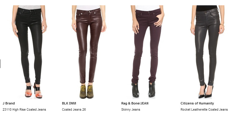I think coated denim is a cool Fall trend, and while these jeans may be a bit on the delicate side (don't wash them at home, unless you're going to handwash them, inside out and with Woolite), they're an awesome alternative to regular dark denim. They come in great jewel tones for the season. Some of my favorites are below, click on the individual styles for a link back on where to buy.